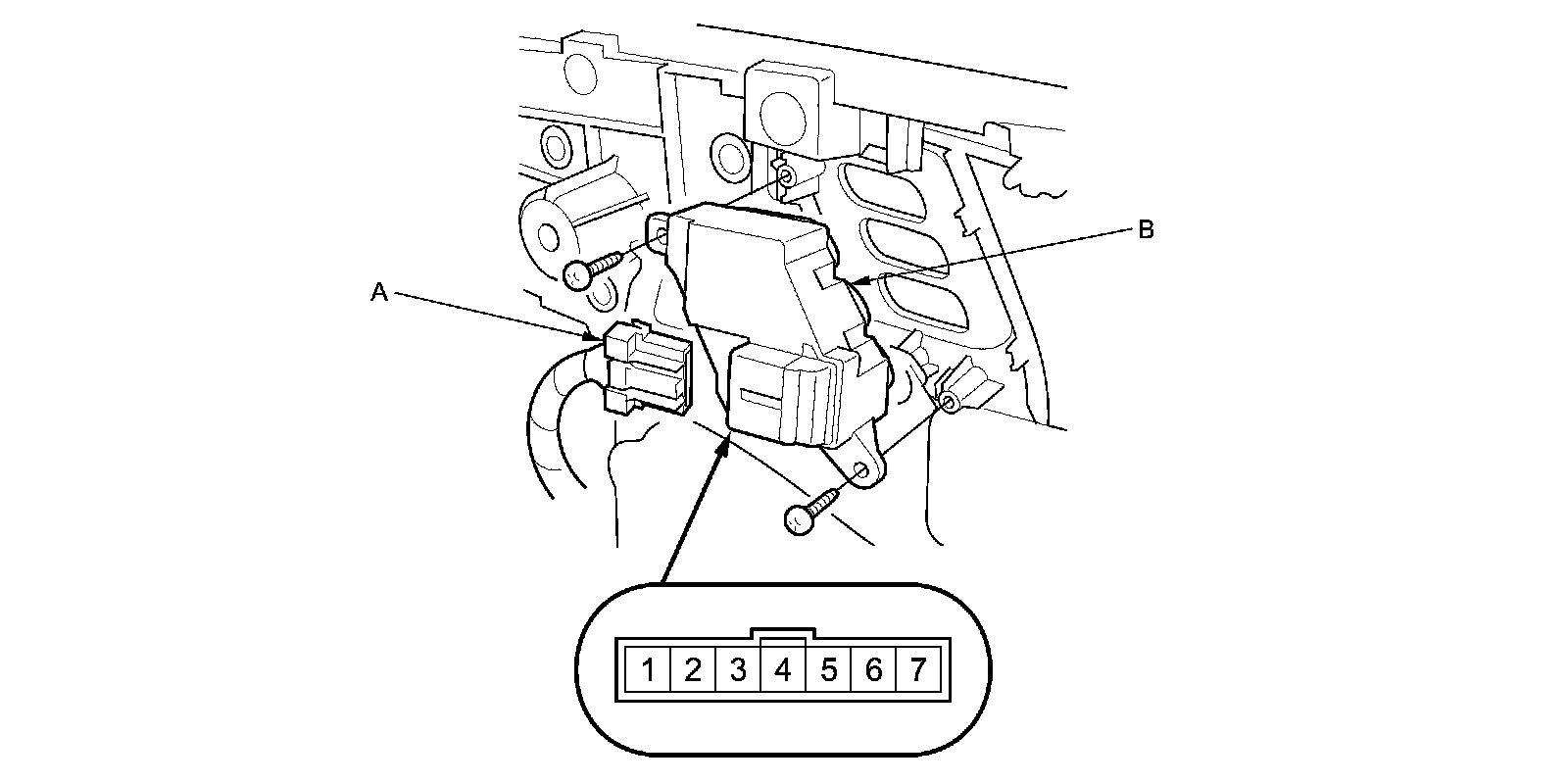 2. Disconnect the 7P connector (A) from the driver's position memory switch (B).