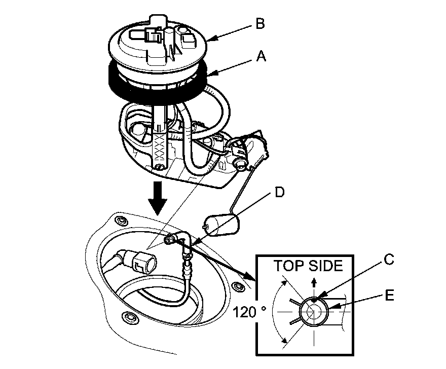 1. Temporarily attach a new base gasket (A) to the fuel tank unit (B), position the mark of the transfer tube (C) up, connect the transfer tube (D), then insert the fuel tank unit partially into the fuel tank.