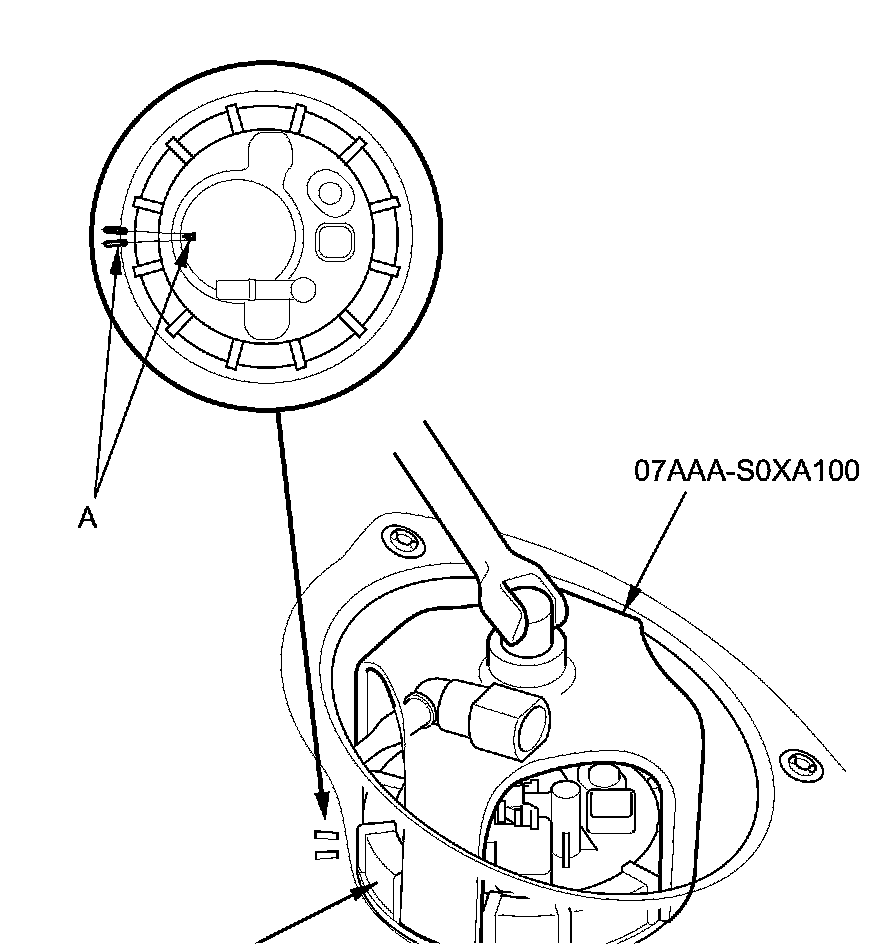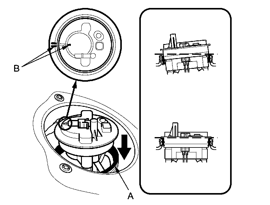 3. Align the marks (B) on the fuel tank and the fuel tank unit, then insert it straight into the fuel tank. Make sure it evenly contacts the base gasket.