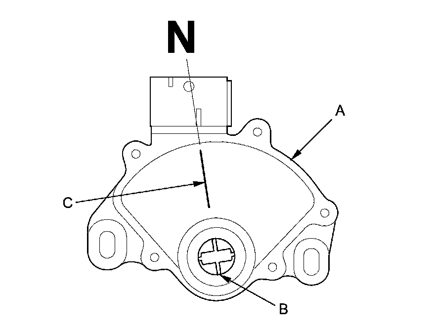 12. Set a new transmission range switch (A) to the N position. The transmission range switch clicks in the N position, and the selector control shaft slot (B) aligns with the N position line (C).