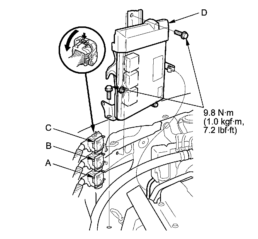13. Disconnect ECM/PCM connectors A, B, and C, then remove the ECM/PCM assembly (D).