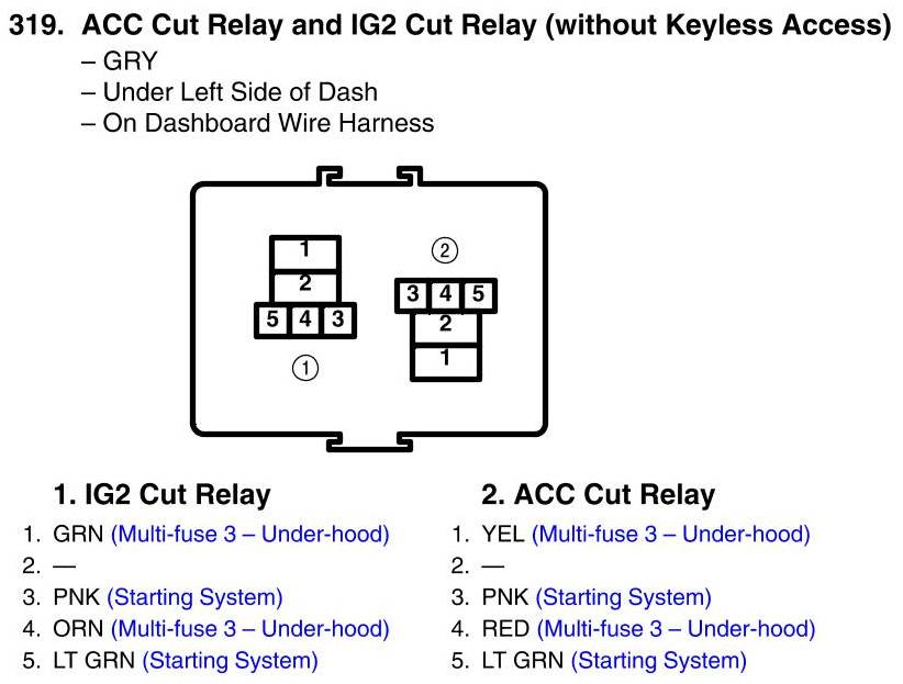 ACC Cut Relay And IG2 Cut Relay Connector View (Without Keyless Access)
