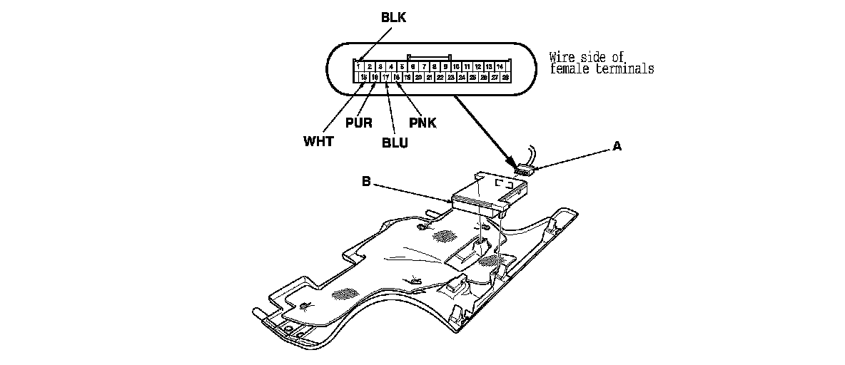 2. Disconnect the 28P connector (A) from the HandsFreeLink control unit (B), and remove it.