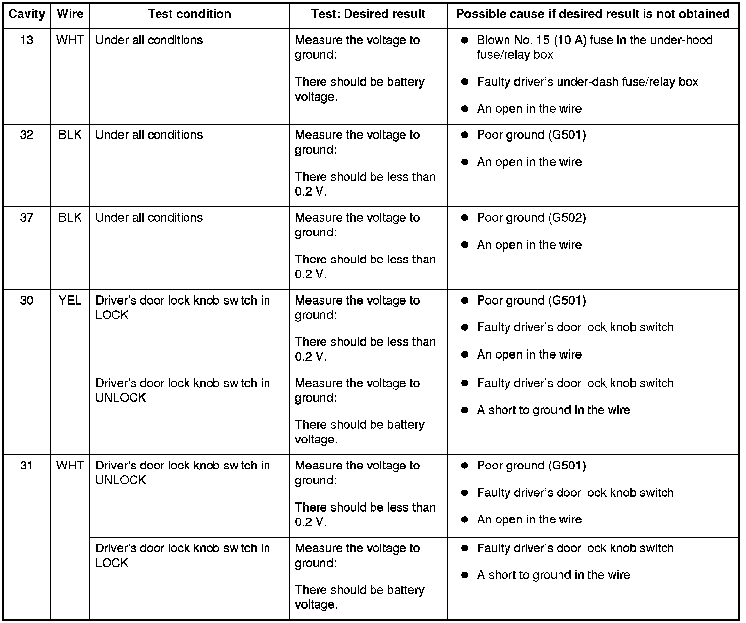 5. Reconnect the connectors to the driver's under-dash fuse/relay box, and do these input tests at the following connectors.