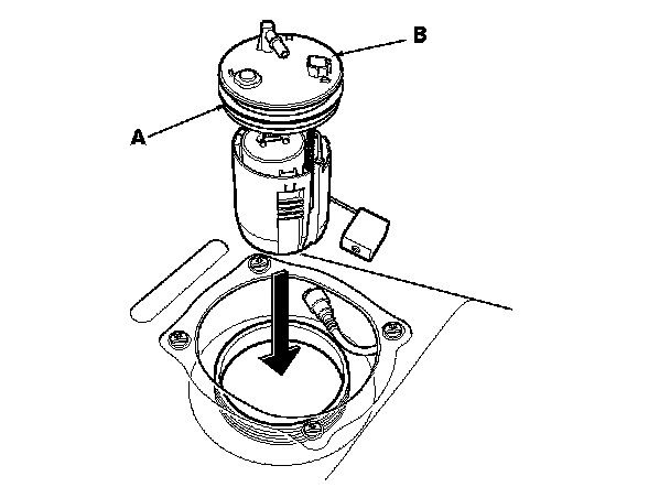 1. Temporarily attach a new base gasket (A) to the fuel tank unit (B), then insert the fuel tank unit partially into the fuel tank.