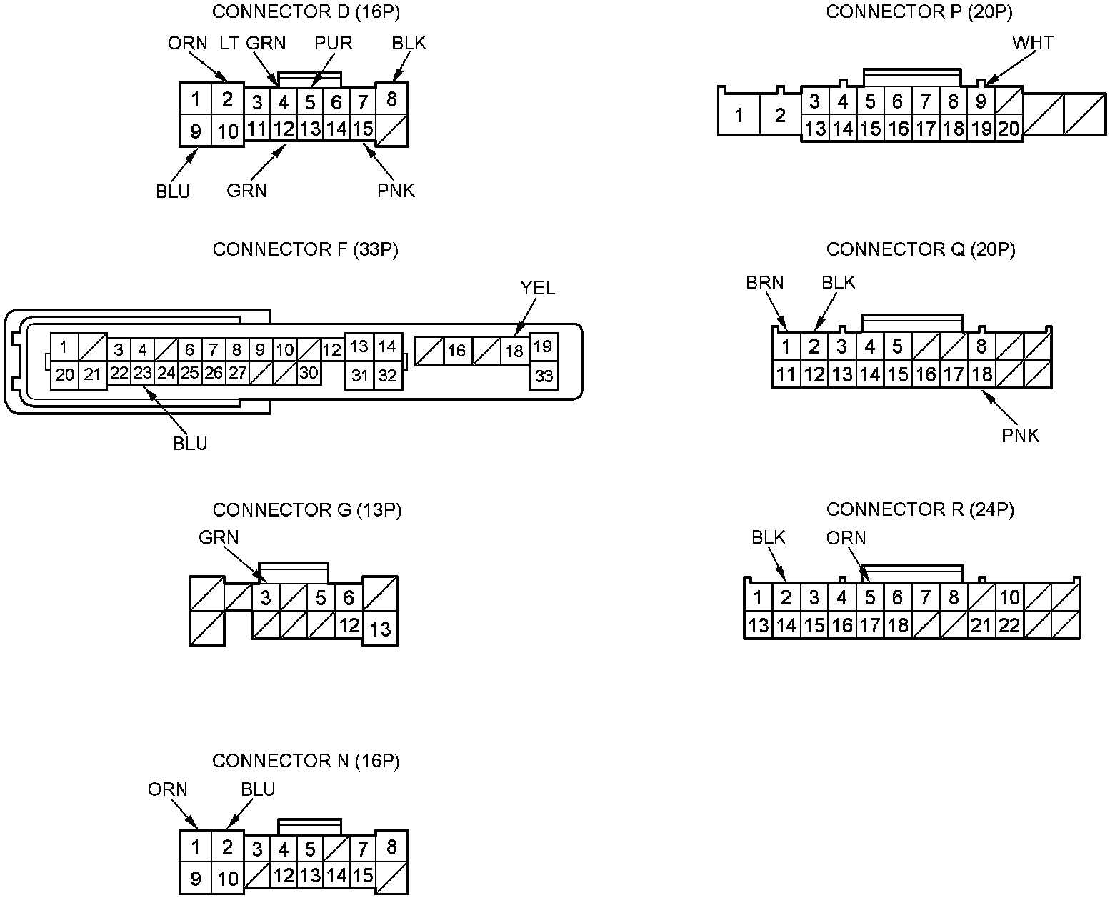 3. Disconnect driver's under-dash fuse/relay box connectors D, F, G, N, P, Q, and R.