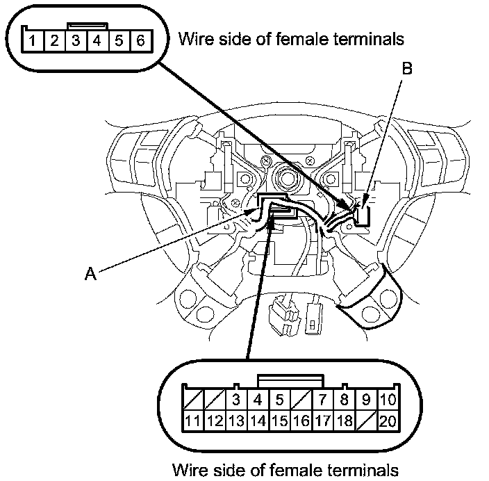 2. Disconnect the 20P connector (A) from the cable reel, and the 6P connector (B) from the multi-information switch.