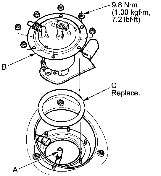 2. Install the fuel tank unit (B) in the reverse order of removal with a new base gasket (C).
