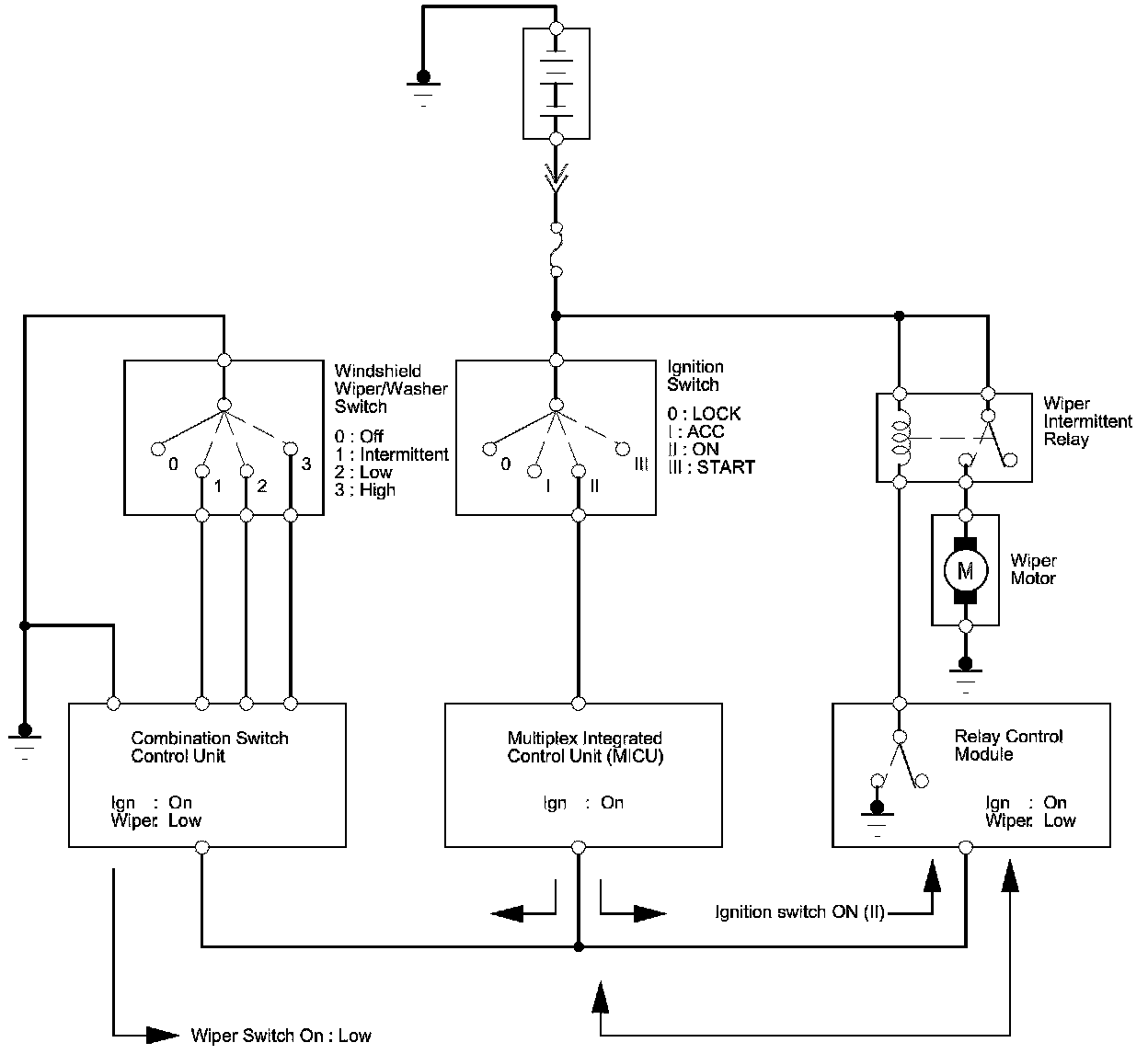 Messages are transmitted by an ECU (that monitors an input) over the communication circuit. ECUs that use the message (information related to that input) are the receivers. For example, the combination switch control unit monitors the wiper switch. When the wiper switch is placed in the low speed position, the combination switch control unit transmits that message on the communication circuit. The relay control module receives the message and turns on the wipers by providing a ground for the relay.