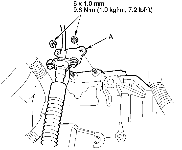 6. Remove the nuts (A) securing the shift cable bracket (B).