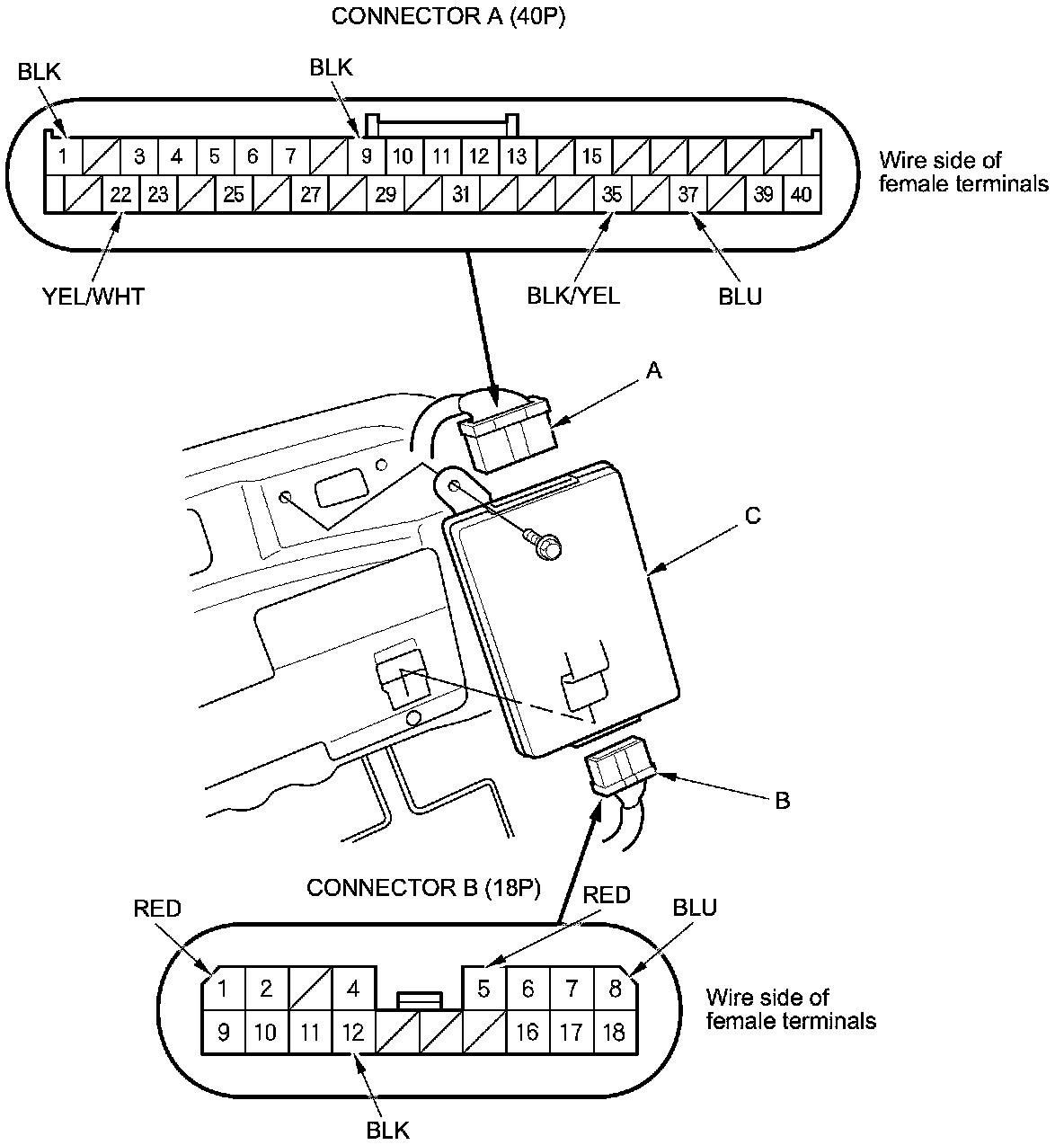 3. Disconnect the 40P connector (A) and 18P connector (B) from the power seat control unit (C).