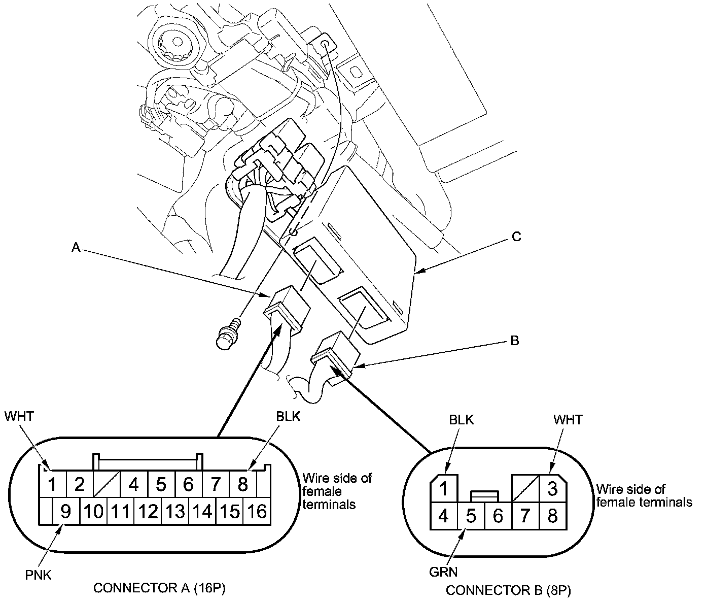 3. Disconnected the 16P connector (A) and the 8P connector (B) from the power tilt/telescopic steering control unit (C).