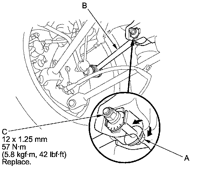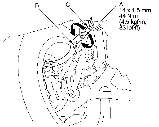 3. Hold the adjusting bolt (A) on the rear control arm (B), and loosen the self-locking nut (C).