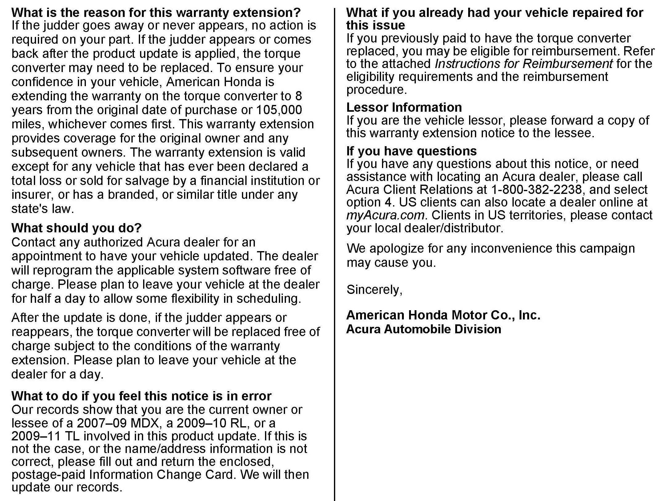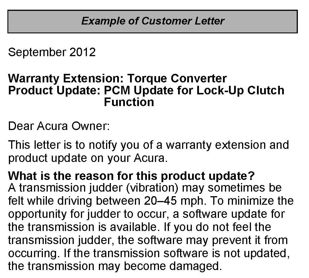 If the judder returns after the transmission software is updated, the torque converter may need to be replaced. To increase customer confidence, American Honda is extending the warranty on the torque converter in affected vehicles to 8 years from the original date of purchase or 105,000 miles, whichever comes first.