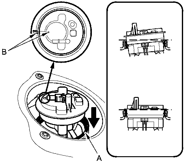 3. Align the marks (B) on the fuel tank and the fuel tank unit, then insert it straight into the fuel tank. Make sure it evenly contacts the base gasket.