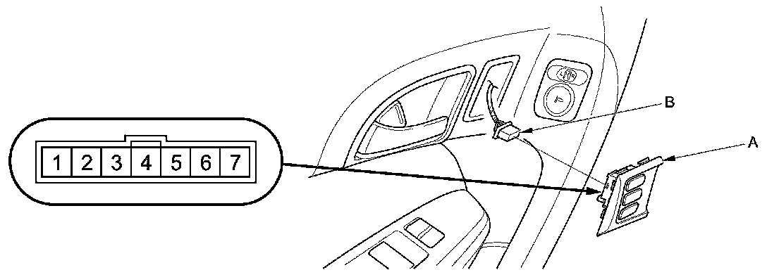 2. Disconnect the 7P connector (B) from the driving position memory switch.