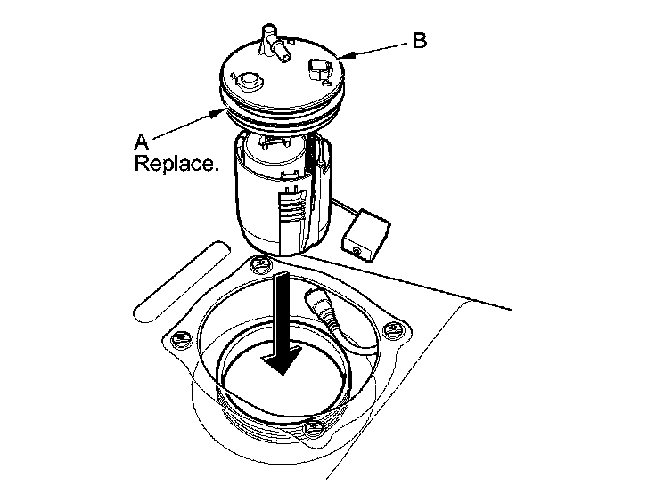 1. Temporarily attach a new base gasket (A) to the fuel tank unit (B), then insert the fuel tank unit partially into the fuel tank.