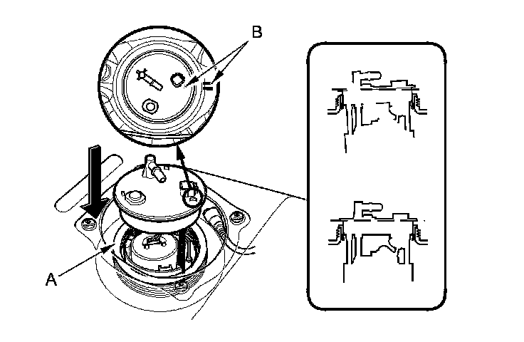 3. Align the marks (B) on the fuel tank and the fuel tank unit, then insert the fuel tank unit into the fuel tank until the fuel tank unit rests on top of the base gasket.