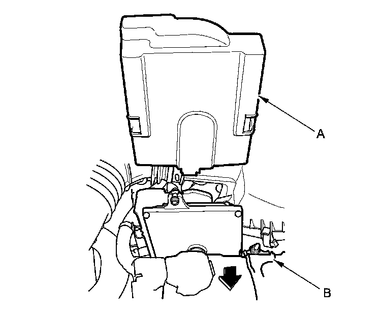 13. Remove the battery setting plate (B), and reposition the battery away from the ECM/PCM.