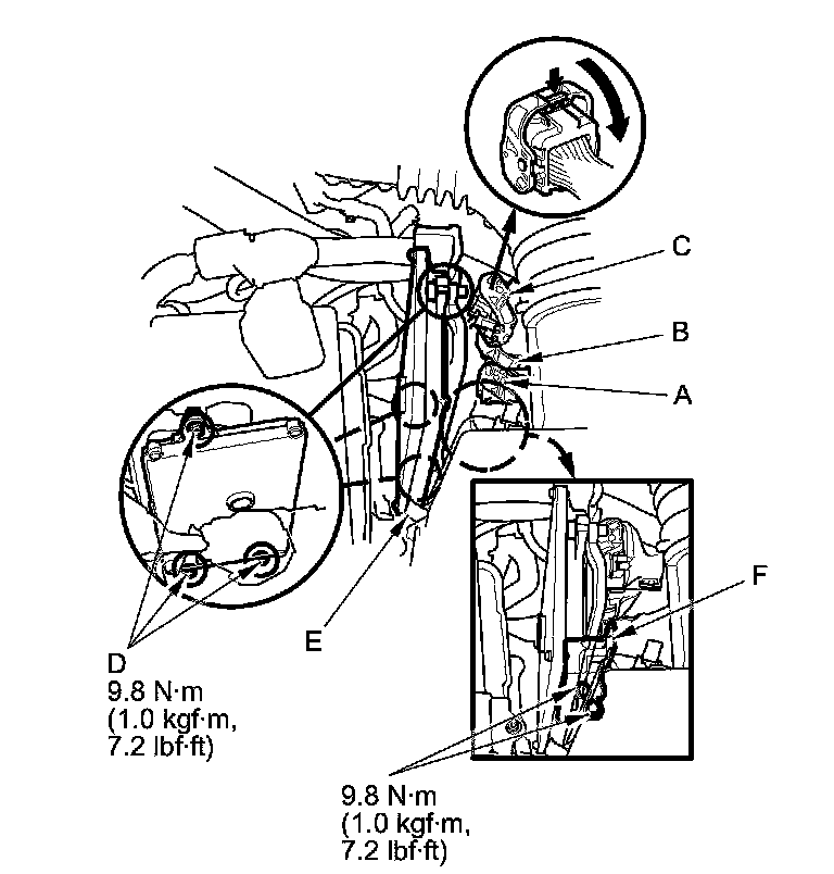 - Canada model: When disconnecting the ECM/PCM connectors, remove the ECM/PCM sub bracket (F).