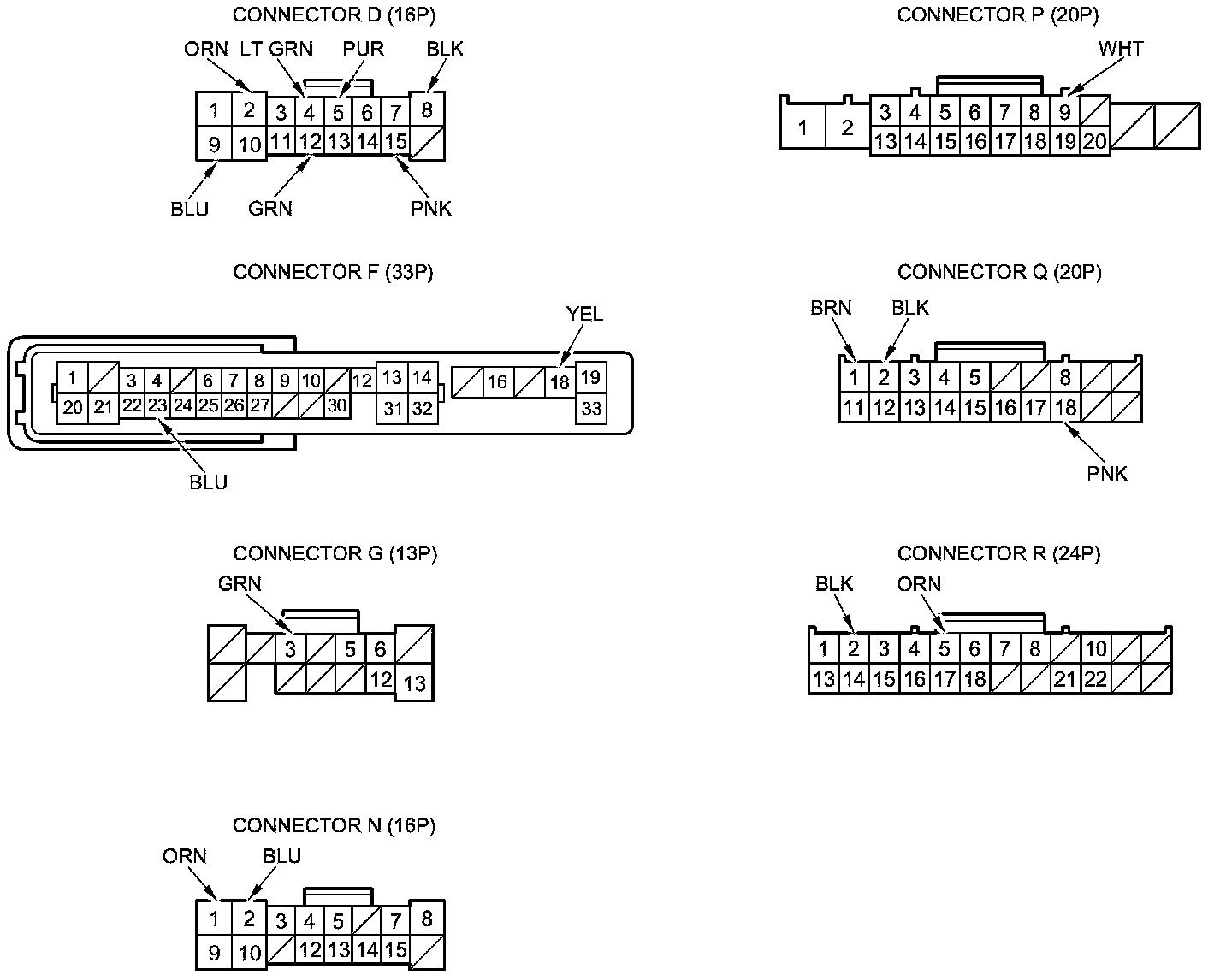 3. Disconnect driver's under-dash fuse/relay box connectors D, F, G, N, P, Q, and R.