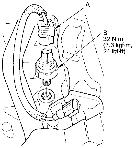 3. Disconnect the knock sensor 1P connector (A), then remove the knock sensor (B).