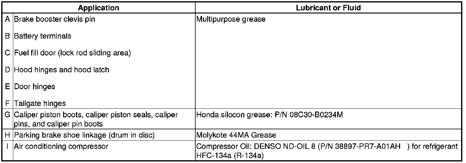 - Lubricate the following areas using the recommended lubricants and fluids.