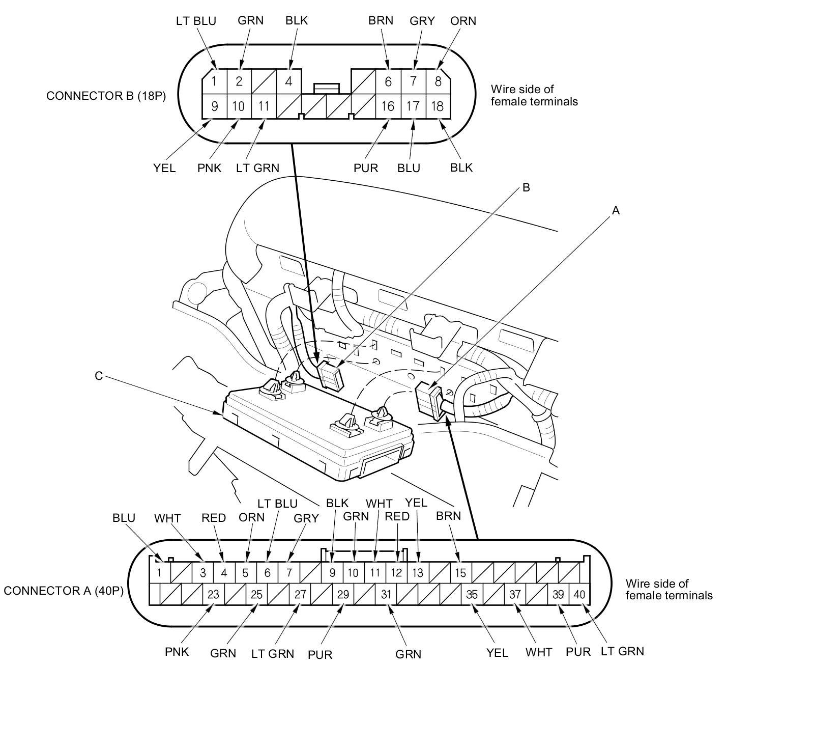 3. Disconnect 40P connector (A) and 18P connector (B) from the power seat control unit (C).