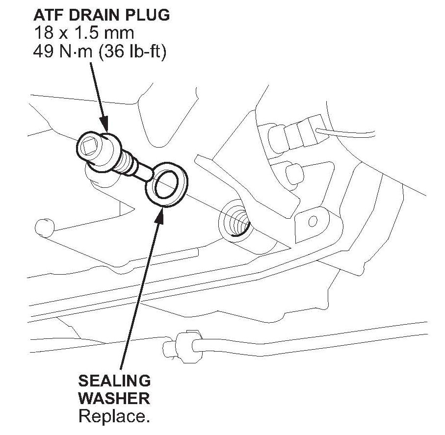 12. Install the ATF filler bolt using a new sealing washer, and torque it to 44 N.m (33 lb-ft).
