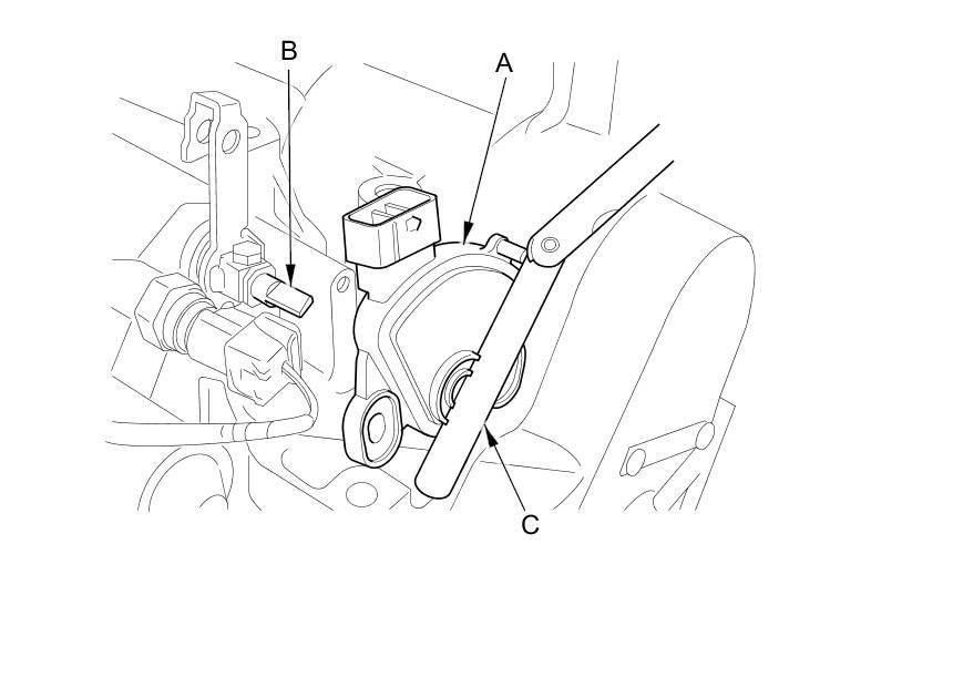 10. Set a new transmission range switch (A) to the N position. Align the cutouts (B) on the rotary-frame with the neutral positioning cutouts (C) on the transmission range switch, then put a 2.0 mm (0.08 in) feeler gauge blade (D) in the cutouts to hold the transmission range switch in the N position.