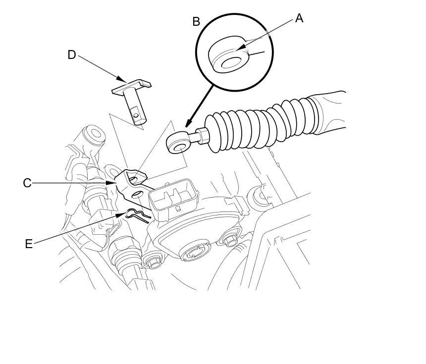 13. Apply molybdenum grease to the center of the bushing (A) on the shift cable end (B). Attach the shift cable end to the control lever (C), then insert the control pin (D) into the control lever hole through the shift cable end, and secure the control pin with the spring clip (E).