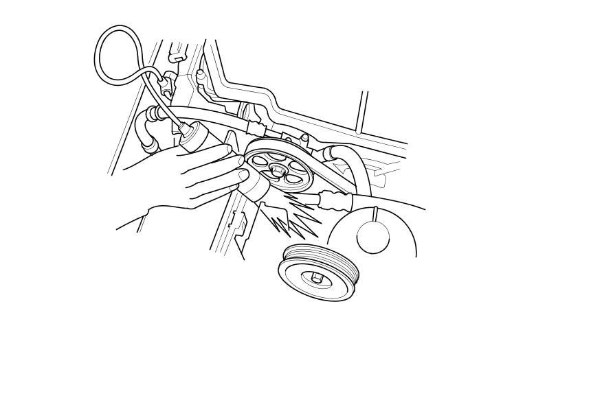 9. Aim the light toward the pointer (A) on the timing belt lower cover. Check the ignition timing under a no load condition (headlights, blower fan, rear window defogger, and air conditioner are turned off).
