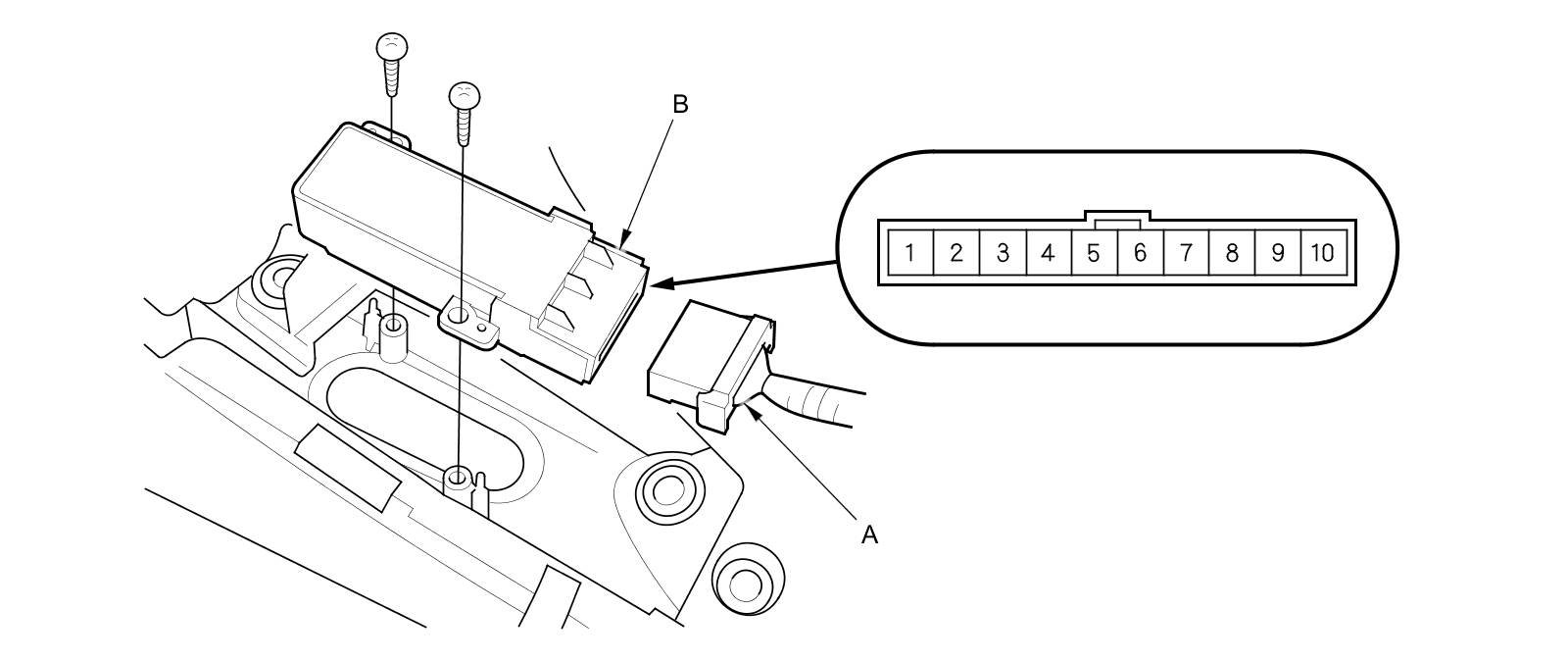 2. Disconnect the 10P connector (A) from the driving position memory switch (B).