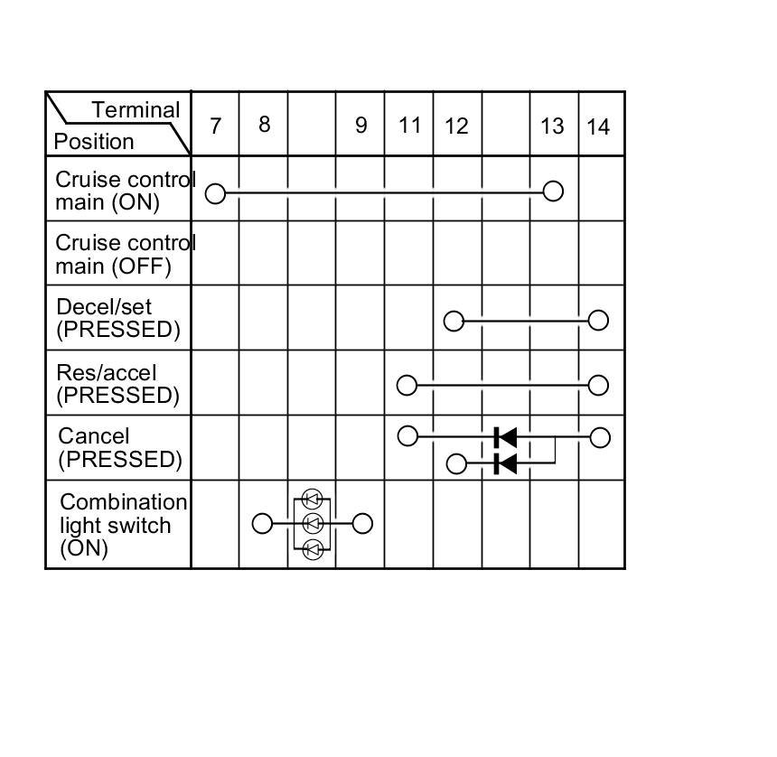 3. Check for continuity between the terminals in each cruise control combination switch assembly position according to the table: