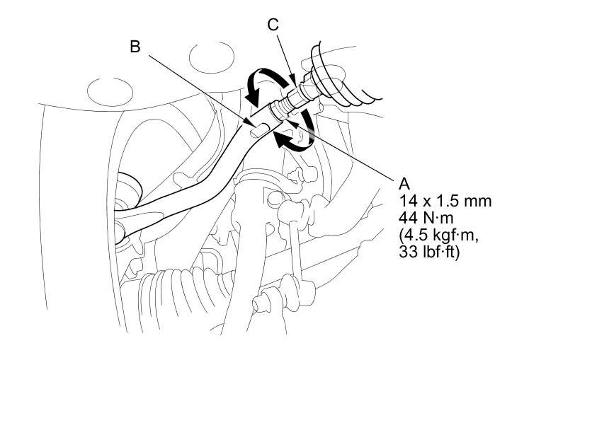 3. Loosen the tie-rod locknuts (A) while holding the flat surface sections (B) of the tie-rod end with a wrench, and turn both rack ends (C) until the front toe is within specifications.