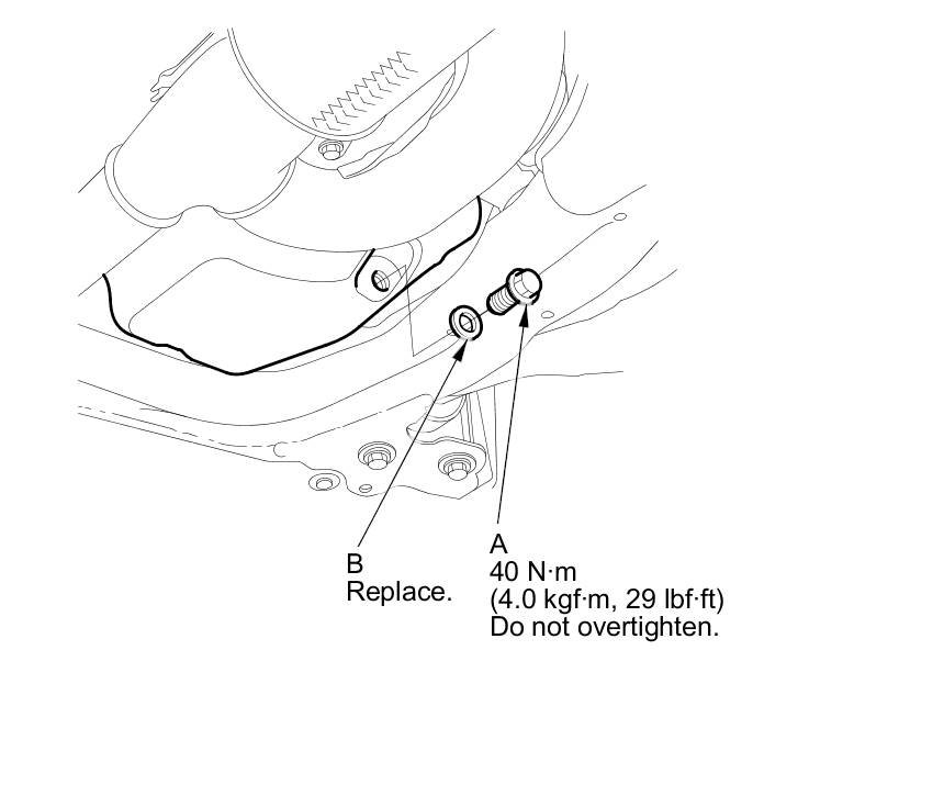 3. Reinstall the drain bolt with a new washer (B) and torque to specification.