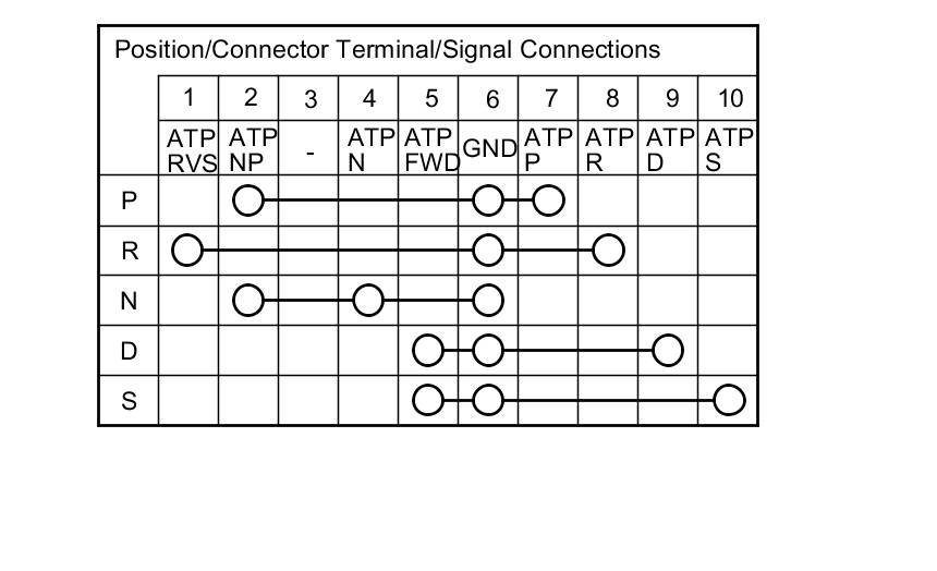 3. Check for continuity between the terminals at the transmission range switch connector. There should be continuity between the terminals in the following table for each transmission range switch position.