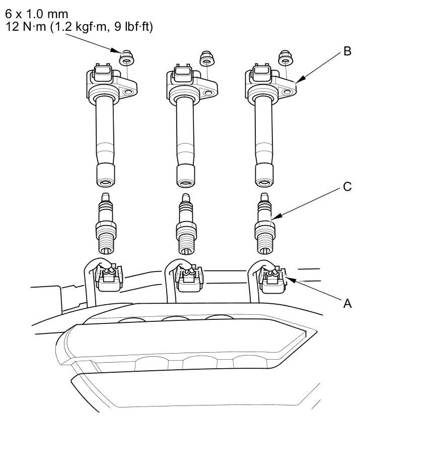 4. Disconnect the ignition coil connectors (A), then remove the front ignition coils (B).