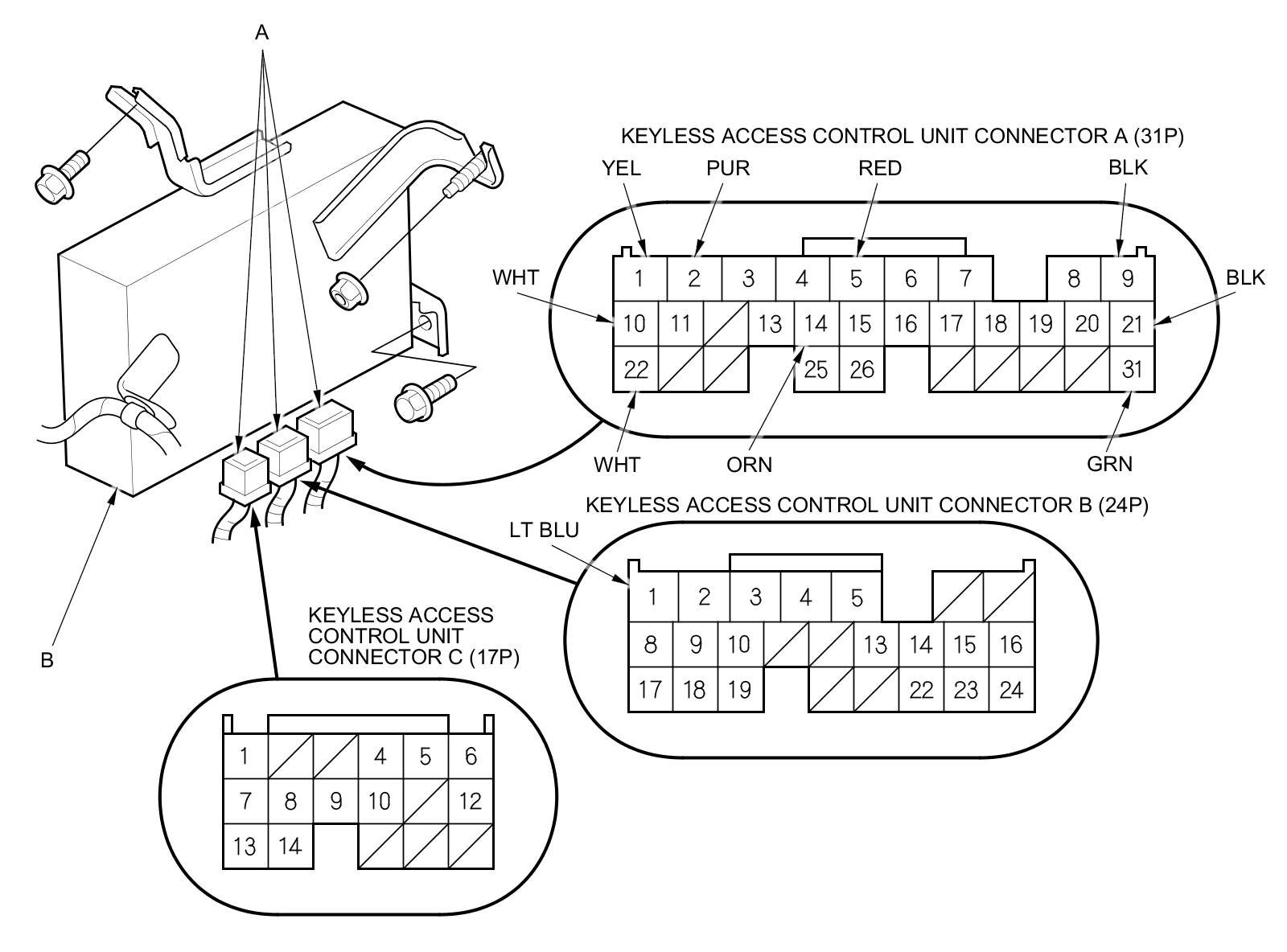 3. Disconnect the connectors (A) from the keyless access control unit (B).