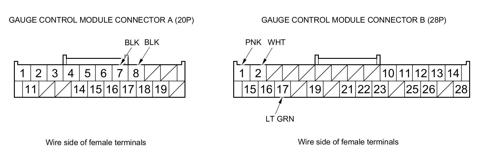 3. Disconnect gauge control module connectors A (20P) and B (28P).