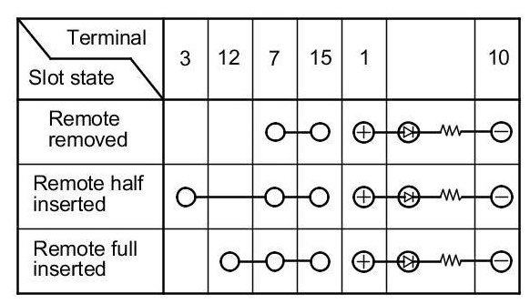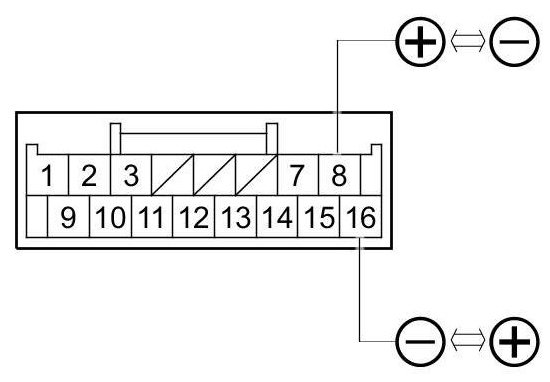 8. Connect the positive battery terminal to remote slot connector terminal No. 16, and the negative battery terminal to terminal No. 8. Check that the remote cannot be removed from the remote slot. Connect the positive battery terminal to remote slot connector terminal No. 8, and the negative battery terminal to terminal No. 16. Check that the remote can be removed from the remote slot.