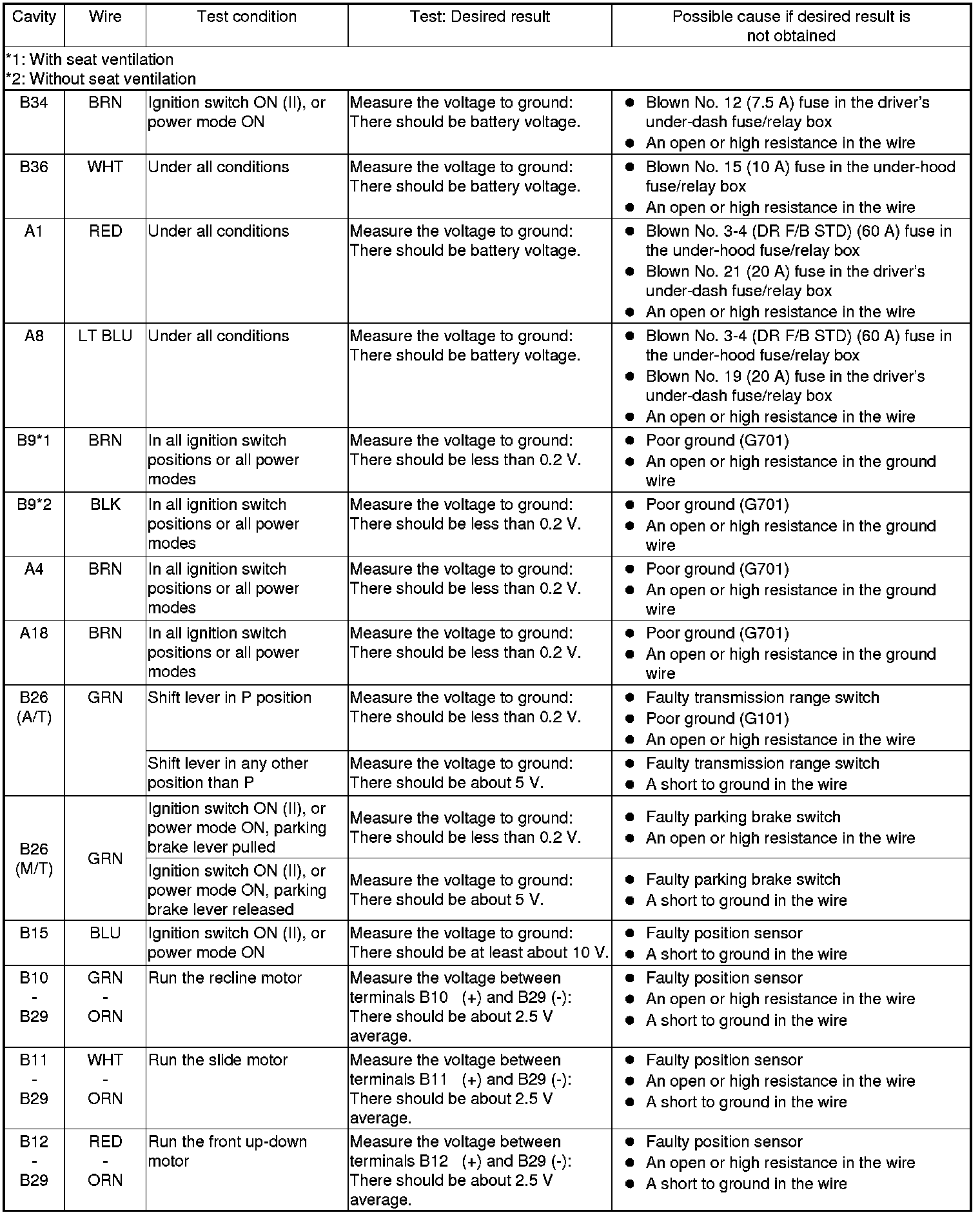 6. Turn the ignition switch to LOCK (0), or press the engine start/stop button to select the OFF mode, then disconnect the connectors from the power seat control unit, and do the following input tests: