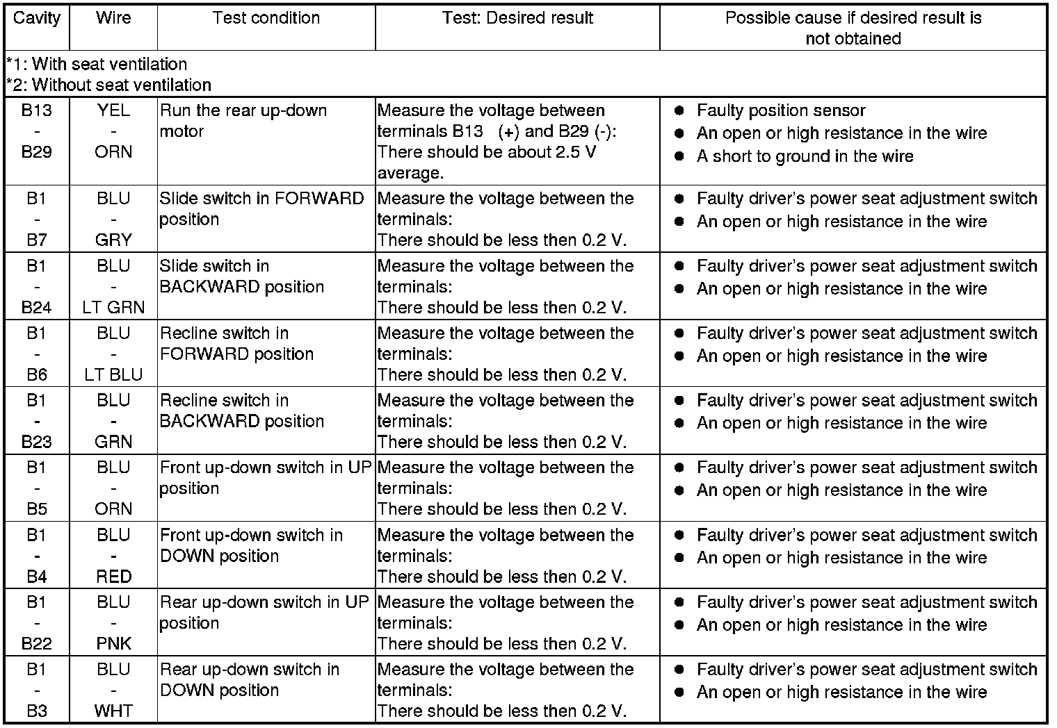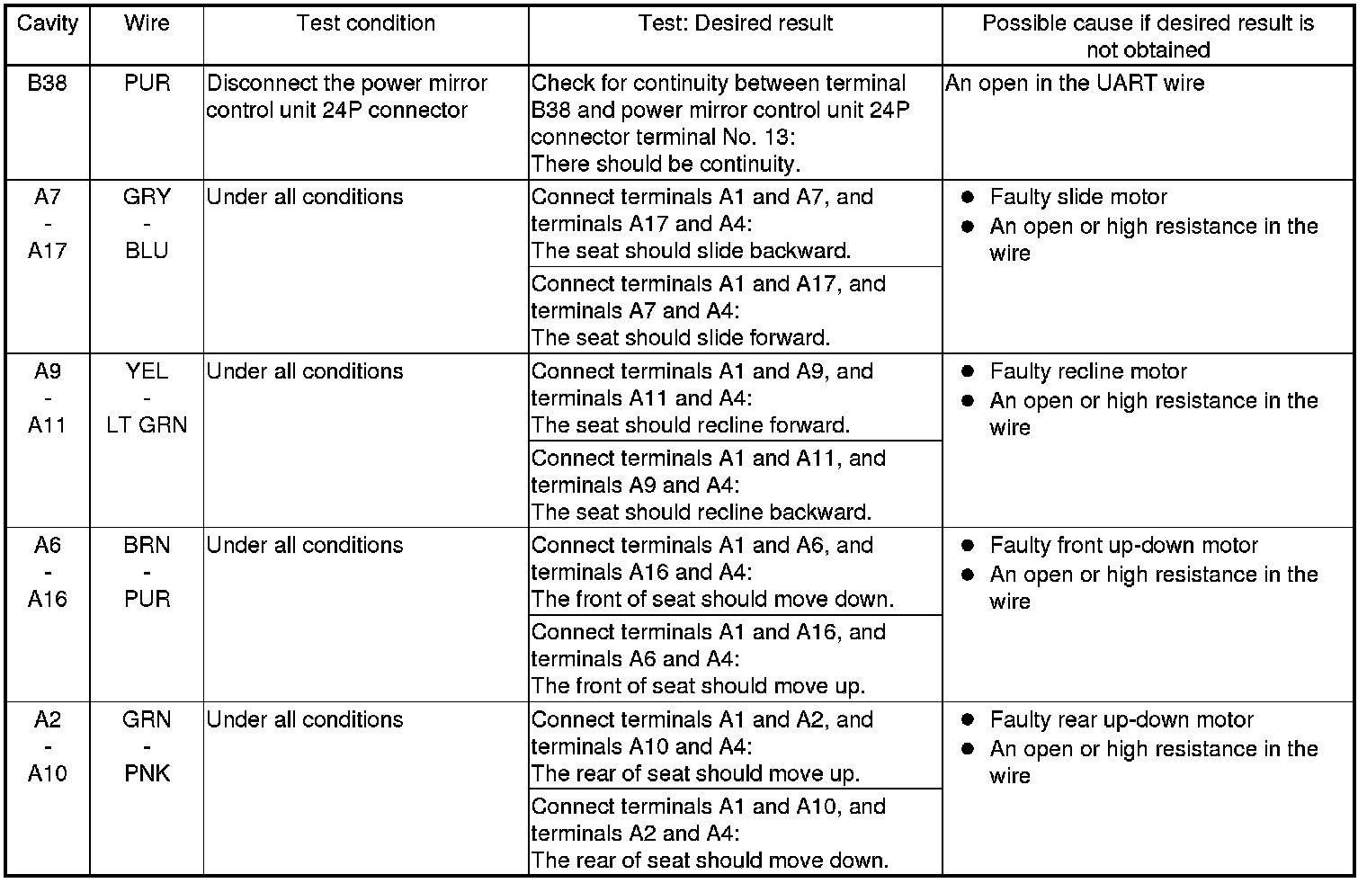 5. Reconnect the connectors to the power seat control unit, and do the following input tests: