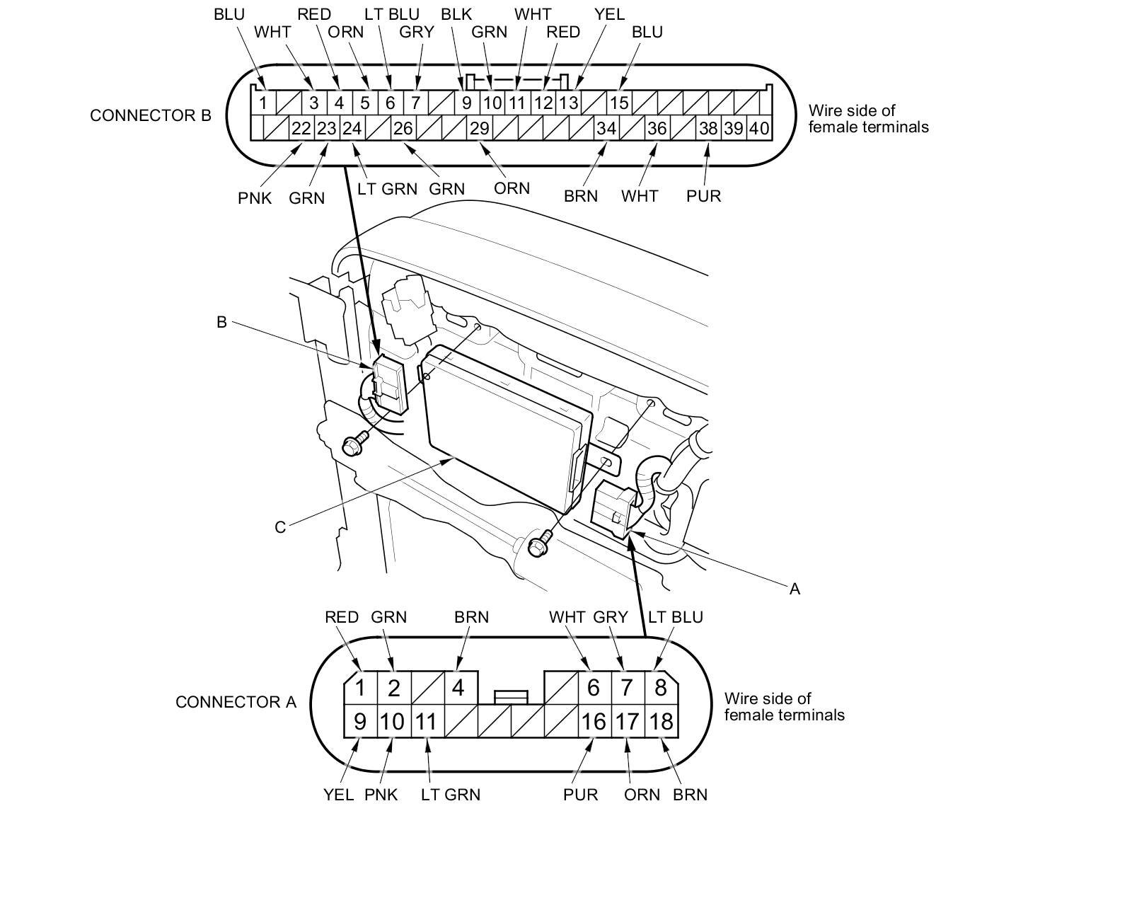 3. Disconnect the 18P connector (A) and 40P connector (B) from the power seat control unit (C).