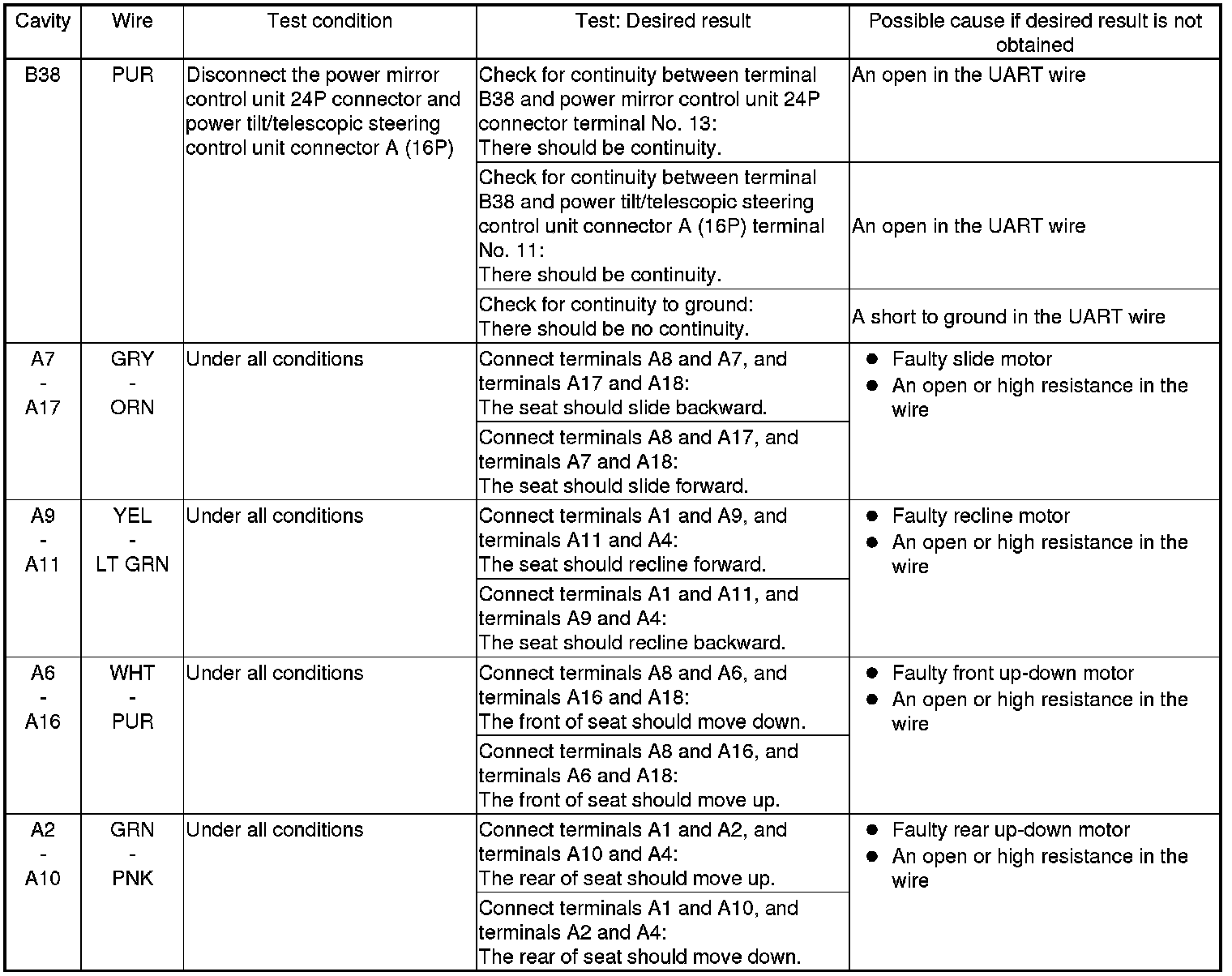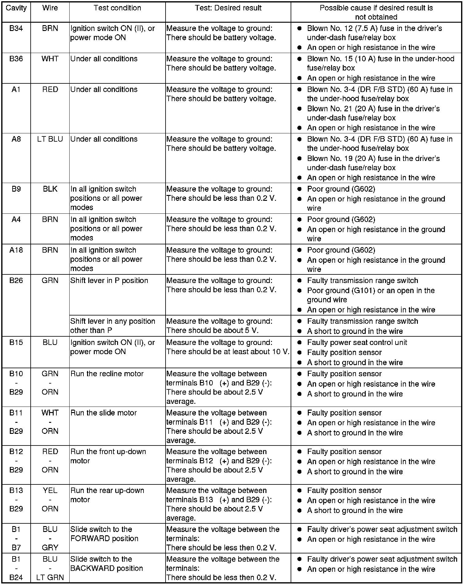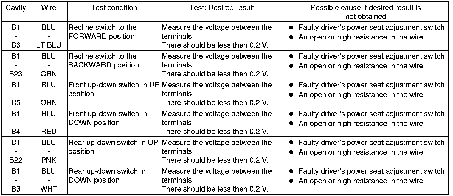 7. Disconnect the connectors from the power seat control unit, and do these input tests at the following connectors.