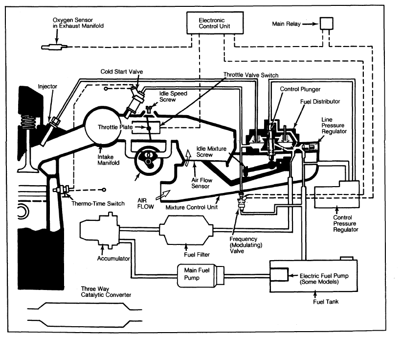 The system consists of the mixture control unit (air-flow sensor and fuel distributor), control pressure regulator, auxiliary air valve, cold start valve, thermo-time switch, injector nozzles, fuel pump, filter, oxygen sensor, electronic control unit, frequency valve, and catalytic converter. Some models use additional components, such as a thermo-vacuum valve, hot start pulse relay, or a constant idle speed control system.