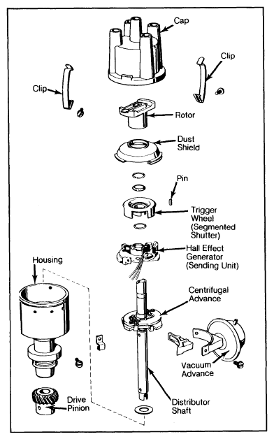 The Hall Effect distributor has normal centrifugal and vacuum advance mechanisms. See Figure and Figure.
