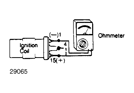 Turn ignition off. Remove all wires from ignition coil. Set an ohmmeter in the low scale and attach its leads to ignition coil primary terminals 1 and 15. See Figure.