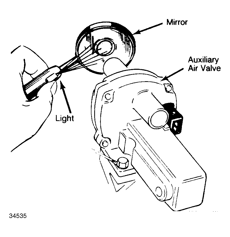 - Disconnect hoses from auxiliary air valve. Use a mirror and small flashlight to inspect valve. See Fig 1 . At room temperature, valve should be slightly open. If equipped, disconnect wires from air flow sensor. With ignition switch "ON" valve should cover opening within 5 minutes.