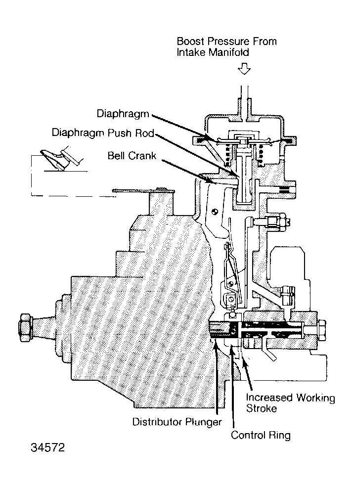 At full throttle, when turbocharger boost pressure is low, no enrichment is needed. As turbocharger boost pressure increases, the pressure begins to work on the enrichment device diaphragm, forcing it down. This turns the bell crank which in turn moves the control ring further to the right. In this manner, the effective stroke of the distributor plunger is lengthened which increases the amount of fuel delivered to the injectors.